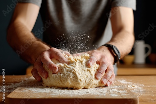 A person kneads dough on a wooden surface, with flour dusting the air, showcasing a hands-on approach to baking.