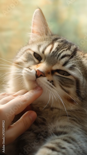 A person lovingly strokes the head of a cute and contented cat, creating a heartwarming moment. Generative AI.