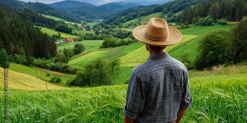 A person, male farmer, in a hat stands on a lush green hill, with wheat plants, overlooking a vast, scenic landscape. The image captures the tranquility and beauty of rural countryside.