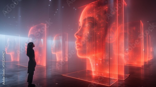 A person observing a series of glowing red holographic human heads in a futuristic dimly lit exhibition space