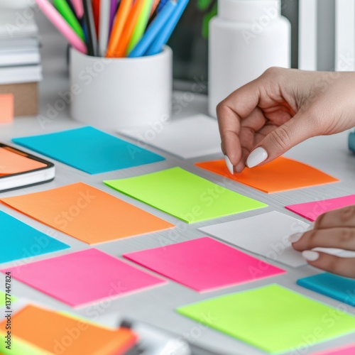 A person organizing colorful sticky notes on a workspace.
