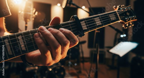 A person playing an acoustic guitar with a capo, focusing on the hand positioning on the fretboard in a dimly lit music studio.