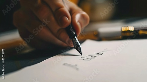 A person practicing calligraphy, with a brush pen in hand and elegant strokes forming letters on quality paper