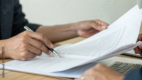 A person reviewing documents with a pen and a laptop on a wooden surface, suggesting a professional or business setting.