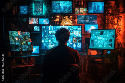 A person sits in a dimly lit room, viewing several computer screens displaying data, images, and code, creating a tech-focused atmosphere.