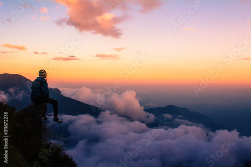 A person sits in the stone and watch the sunset from the height of the hill.