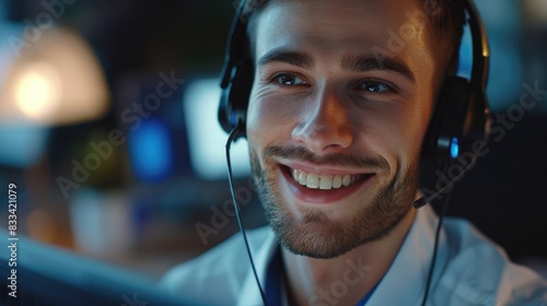 A person sitting in front of a computer, wearing headphones and focused on the screen