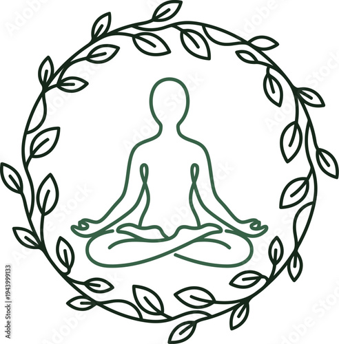 A person sitting in meditation pose surrounded by leaves for eco wellness and sustainable health icon concept.
