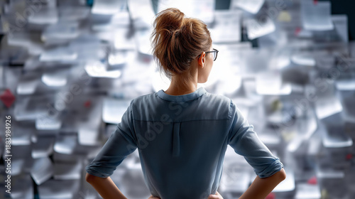 A person standing before a wall covered with tasks, notes and formulas, overwhelmed yet determined, facing a challenge that feels almost impossible