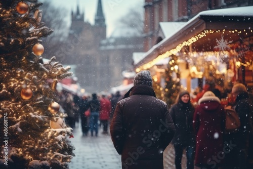 A person standing in front of a festive Christmas tree. This image can be used to depict the holiday season and the joyous atmosphere of Christmas celebrations