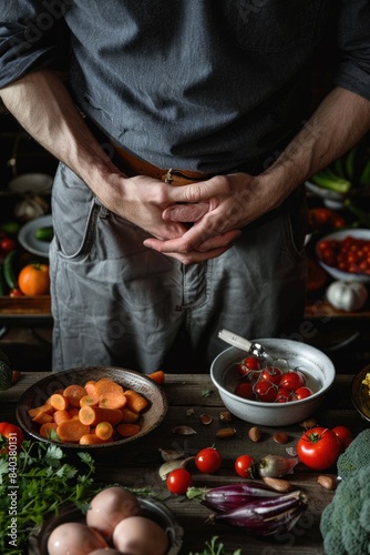 A person standing next to a table filled with various vegetables, ideal for use in health or cooking related contexts