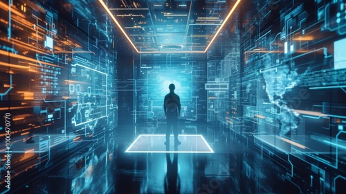 A person stands alone in a high-tech room filled with glowing holographic displays. The blue and orange neon lights create a digital, futuristic ambiance. The reflection on the floor adds depth to the