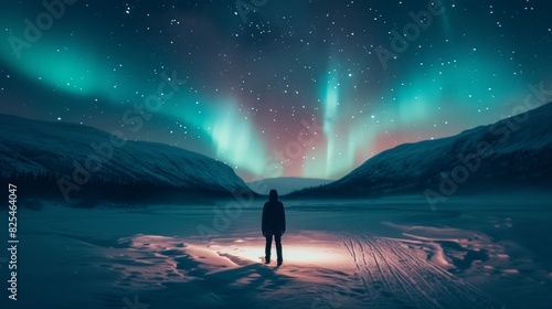 A person stands in snow field with beautiful aurora northern lights in night sky in winter.