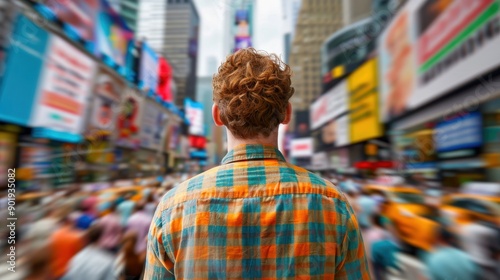 A person stands in Times Square, surrounded by a bustling crowd and vibrant billboards, capturing the city's vibrant energy.