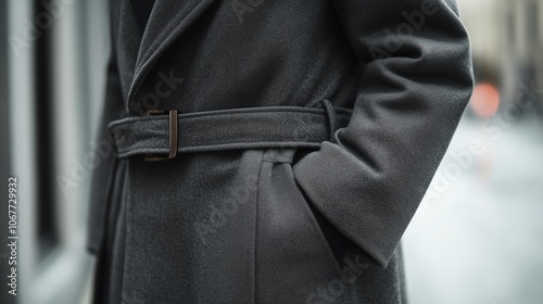 grey, coat, urban, street, rainy, weather, chilly, afternoon, fashion, outerwear, style, comfort, pocket, city, life, casual attire, attire, overcast, day, sophistication, warmth, cosy, texture, modern, individual, posture, garment, design, setting, wet, pavement, relaxed, look, cool, climate, contemporary, trendy, outfit, minimalism, detail, clothing, drape, aesthetic, profile, elegance, everyday, wear, muted, colours
