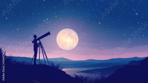 night, star, moon, sky, telescope, person, silhouette, landscape, mountain, hill, water, tree, nature, watching, observing, astronomy, space, darkness, twilight, evening, outdoors, horizon, celestial, light, full, bright, peaceful, calm, scenic, distant, huge, beautiful, perspective, illustration, design, gradient, scene, view, adventure, exploration, dream, wonder, exploring, field, grass, travel, serene