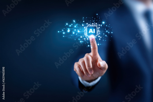 A person touching a digital interface displaying "AI," symbolizing the interaction between humans and artificial intelligence.