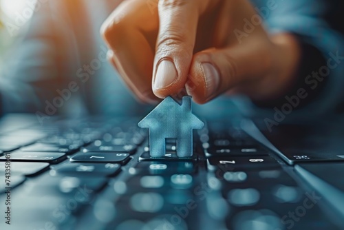 a person touching a laptop keyboard with an up arrow pointing at a house, in the style of flat abstraction,