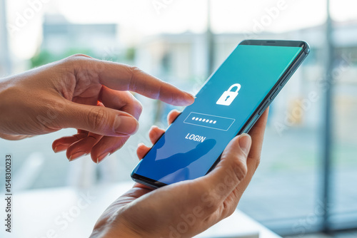 A person uses a smartphone for secure login, displaying a lock icon and password field on the screen. Enhance mobile security with a strong password for safer digital experiences.