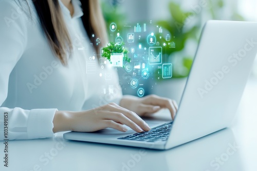 A person using a laptop with digital icons representing technology and innovation on the screen, symbolizing modern connectivity.