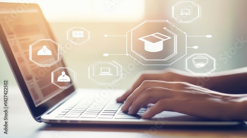 A person using an AI-powered interface to create digital educational content on their laptop,