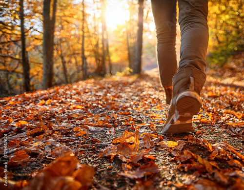 A person walks through fallen autumn leaves on a forest path while golden sunlight filters through the trees.