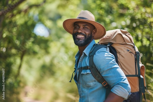 A person wearing a hat and carrying a backpack, suitable for outdoor or travel use