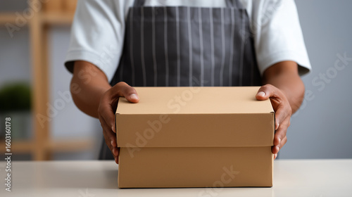A person wearing an apron holds a plain brown cardboard box on a wooden surface, ready for delivery or shipping.