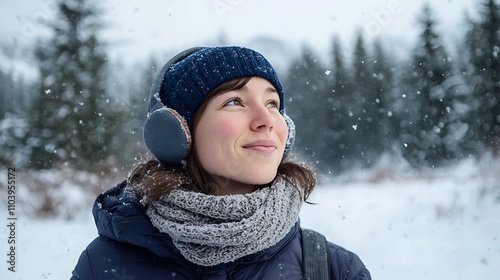 A person wearing cozy ear warmers and a knitted scarf while walking in a snowy winter landscape