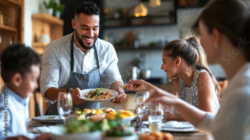 A personal chef smiling as they serve a gourmet dish to a family in a private dining room.
