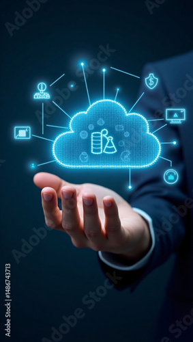 A person's hand is holding a glowing cloud computing diagram, which suggests a virtual data storage and accessibility concept. This image is ideal for showcasing cloud-based services, data protection.