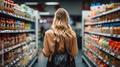 A photo of a beautiful young american woman shopping in supermarket and buying groceries and food products in the store. photo taken from behind her back