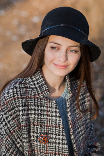 A photo of a carefree girl strolling against the background of trees in early spring 3514.