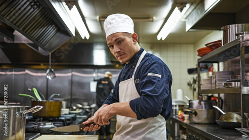 A photo of a cook in a kitchen, wearing a white hat and a blue uniform. He is holding a knife and is standing near a cutting board. In the background, there are pots, pans, and cooking utensils.