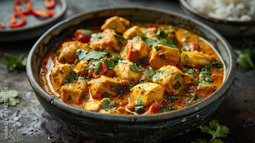 A photo of a hearty chicken curry with tender pieces of chicken simmered in a fragrant tomato and coconut milk sauce.