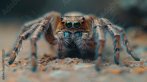 A photo of a Phidippus audax, a bold jumper spider, on sandy ground. Its colors and large green eyes stand out. It looks focused facing the camera in a sandy setting.