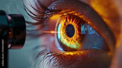 A photo of an eye with a laser cutting device.