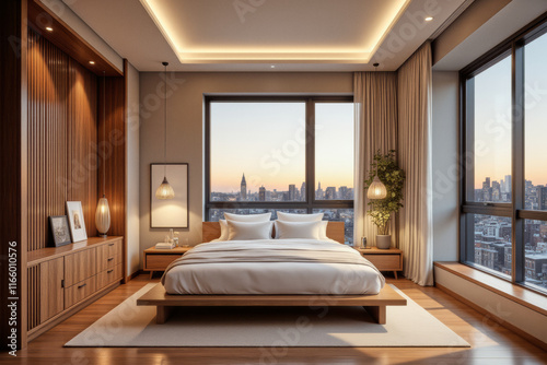 room, home, apartment, nobody, indoor, decor, house, furniture, bedchamber, minimalism, architecture, nightstand, bed, curtain, luxurious, dresser, decorative, ceiling, interior, wooden, light, lamp, contemporary, style, comforter, panoramic, pillow, wall, luxury, panel, floor, elegant, wood, minimalistic, paint, modern, greenery, colours, sunset, view, vase, design, beige, live, skyline, city