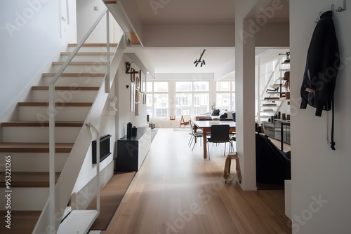 A photo of the interior of an apartment in Amsterdam, a white staircase with wooden steps and white walls. The upper floor is an open plan living room and dining area with modern furniture