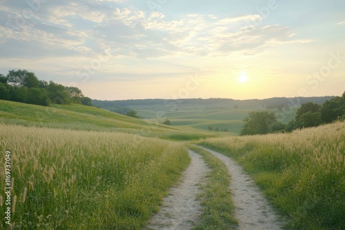 A photo of the rolling hills and fields of green wheat in Eastern Brookfield. The sun is setting, casting long shadows over gently swaying waves of grain. A winding path leads into a hazy horizon