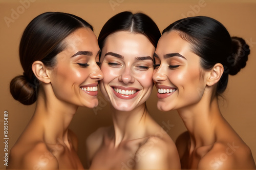 A photo of three beautiful women smiling and posing for the camera