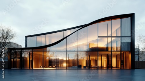 A photograph showcasing a modern building with sleek glass surfaces and flowing curves, embodying contemporary architecture and innovation in urban design.