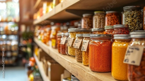 A photograph showcasing a row of neatly arranged and organized canned goods jars and dry products displayed on store shelves with an empty aisle in the foreground