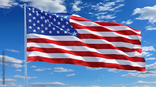 photorealistic, american, flag, waving, proudly, wind, red, white, stripes, billow, dramatically, blue, field, star, crisp, clear, background, sky, fluffy, cloud