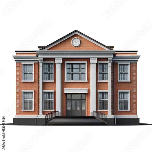 A photorealistic illustration of an exterior view of a two-story brick school building, 3D rendering isolated on Transparent background