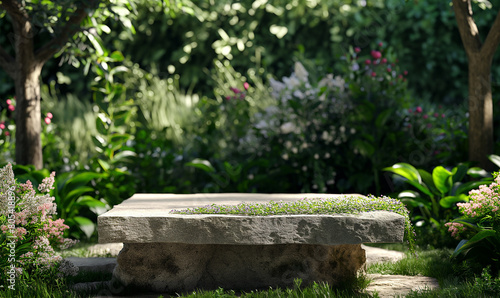 A photorealistic image of an outdoor podium in the garden, surrounded by lush greenery and blooming flowers. The podium is made from natural stone with a smooth surface