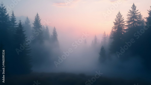 landscape, forest, tree, fog, dawn, mystical, serene, evergreen, nature, photorealistic, timberland, atmosphere, coniferous, sunrise, tranquil, aethereal, dreamy, peaceful, scenic, environment, wilderness, misty, wood, silhouette, morning, twilight, solitude, quiet, soft, calming, wood, natural, light, skyline, sky, haze