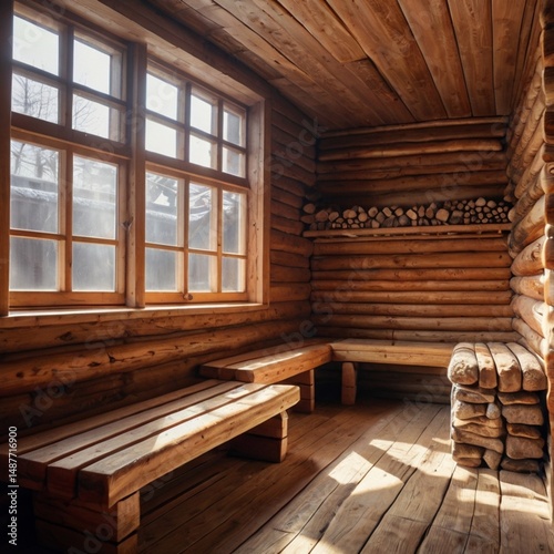 a photorealistic wide shot of a traditional russian banya interior with wooden benches, steam rising from heated stones, birch branches (venik) on shelf, soft natural light from small window, 16:9 rat