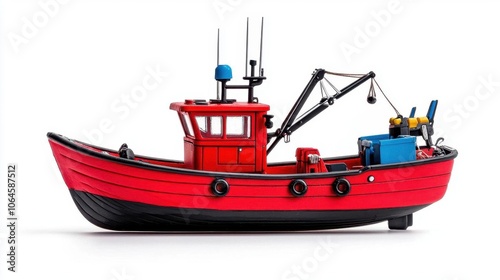 A photostock of a red fishing boat on a white background, isolated and nautical.