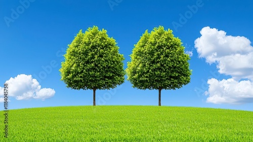 A photostock of a serene green landscape with neatly aligned trees and a soft grassy patch, captured beautifully against a clean background, symbolizing nature's harmony. High Quality